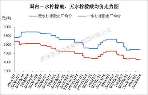 據(jù)網(wǎng)絡(luò)數(shù)據(jù)監(jiān)測(cè),截止8月24號(hào),國(guó)內(nèi)一水檸檬酸出廠均價(jià)在4140元/噸,無(wú)水檸檬酸出廠均價(jià)4700元/噸,市場(chǎng)成交實(shí)單實(shí)談,商談空間大。國(guó)內(nèi)一水檸檬酸均價(jià)環(huán)比上月同期跌幅在1.90%,同比去年同期跌幅11.73%,無(wú)水檸檬酸均價(jià)環(huán)比上月跌幅0.42%,同比去年同期跌幅13.12%。