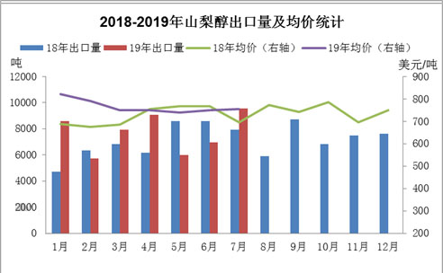 由上圖可以看出2019年7月份山梨醇出口量及出口均價(jià)較上月均有增加。據(jù)海關(guān)數(shù)據(jù)統(tǒng)計(jì)(29054400山梨醇)7月份出口量為9570.74噸,出口金額7216700美元,出口均價(jià)754.04美元/噸。2019年7月份出口量環(huán)比上月增幅37.25%,同比去年增幅20.62%,出口均價(jià)環(huán)比增幅0.41%,同比增幅8.42%。7月份山梨醇出口需求增加,或?qū)⒁欢ǔ潭染徑鈬?guó)內(nèi)市場(chǎng)供應(yīng)壓力,一定程度提振國(guó)內(nèi)市場(chǎng),所以在此利好推動(dòng)下8月份山梨醇市場(chǎng)繼續(xù)延續(xù)偏強(qiáng)運(yùn)行態(tài)勢(shì)。